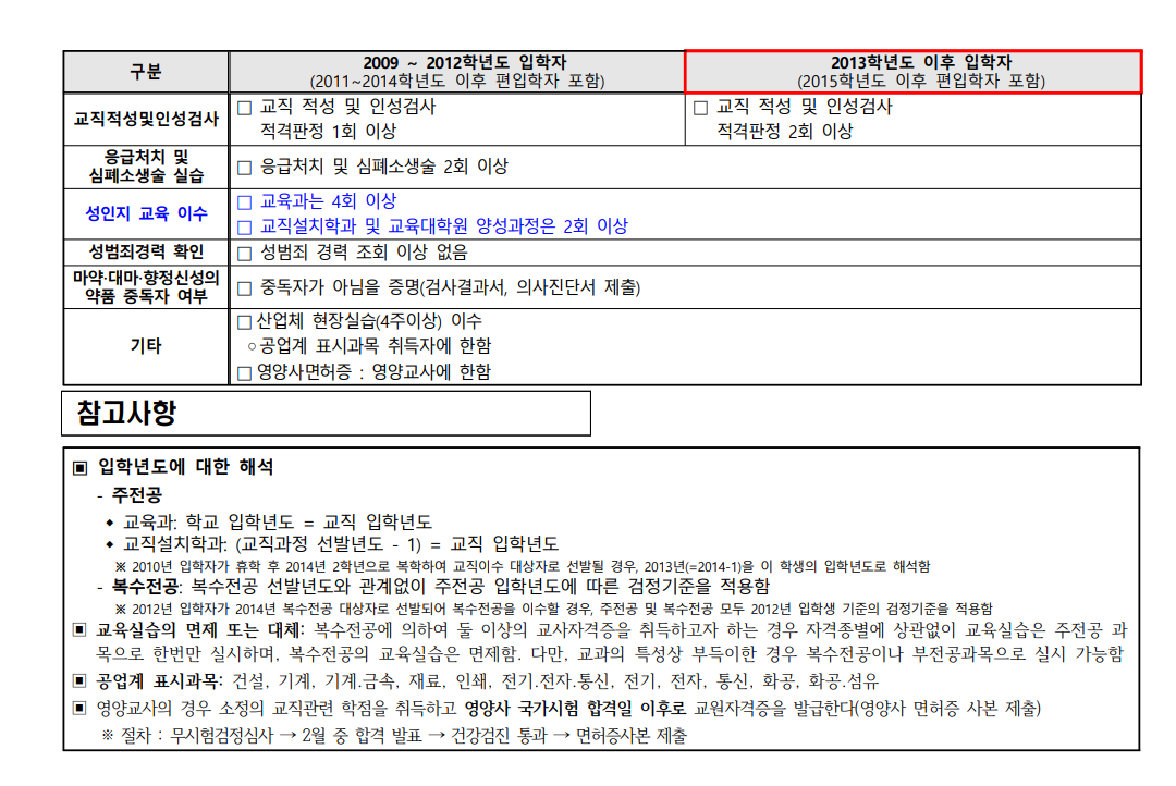 접수 기간: 2025. 12. 15.(월) 09:00 ~ 2026. 1. 2.(금) 18:00 접수 장소: 국립부경대학교 학사관리과(대학본부 106호) 교원자격 무시험검정 심사 안내 ? 심사방법: 교원양성위원회를 통한 자격요건 심사 ※ 자격요건(상세 요건은 소속 학부(과)사무실에서 확인) ① 졸업요건 충족 확인 ② 전공 및 교직과목 이수확인(성적기준 포함) ③ 응급처치 및 심폐소생술 실습 이수 여부 ④ 교직 적성 및 인성검사 판정결과 확인 ⑤ 성인지 교육 이수 여부 ⑥ 기타 산업체 현장실습 이수여부 및 영양사 면허증 제출 확인 ⑦ 성범죄경력 확인 여부 ⑧ 마약?대마?향정신성의약품 중독 여부 확인