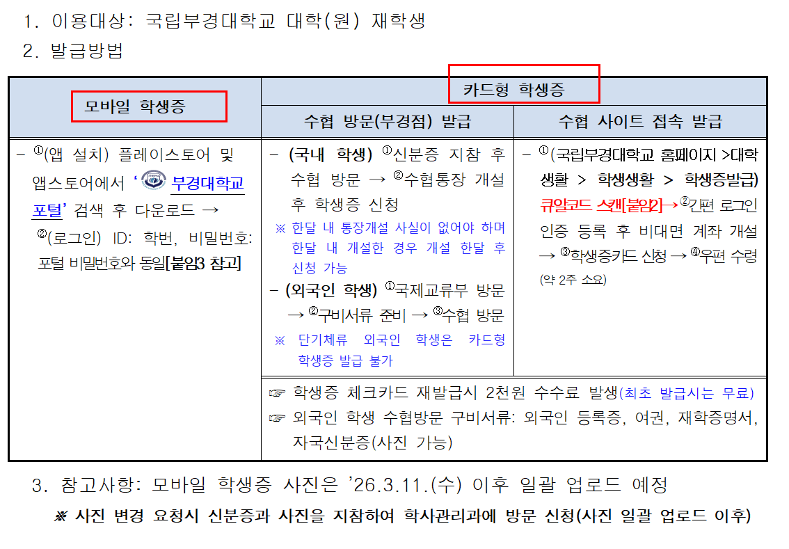 학생증 발급 방법(모바일,카드형)
