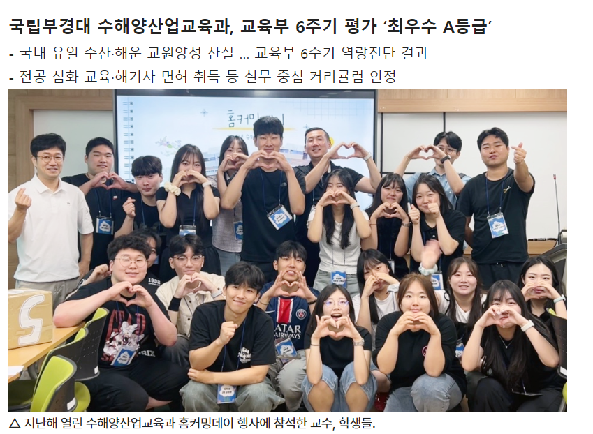 국립부경대 수해양산업교육과는 이번 평가 결과를 토대로 국가기간산업인 해양·수산 분야의 교육 거점으로서의 역할을 더욱 강화해 나갈 계획이다. <부경투데이> Pukyong National University’s Department of Fisheries and Marine Industry Education Receives Top “A” Rating in the Ministry of Education’s 6th-Cycle Evaluation - The nation’s only teacher-training program for fisheries and maritime education; results of the Ministry of Education’s 6th-cycle competency evaluation - Practice-oriented curriculum recognized, including advanced major training and maritime officer license acquisition